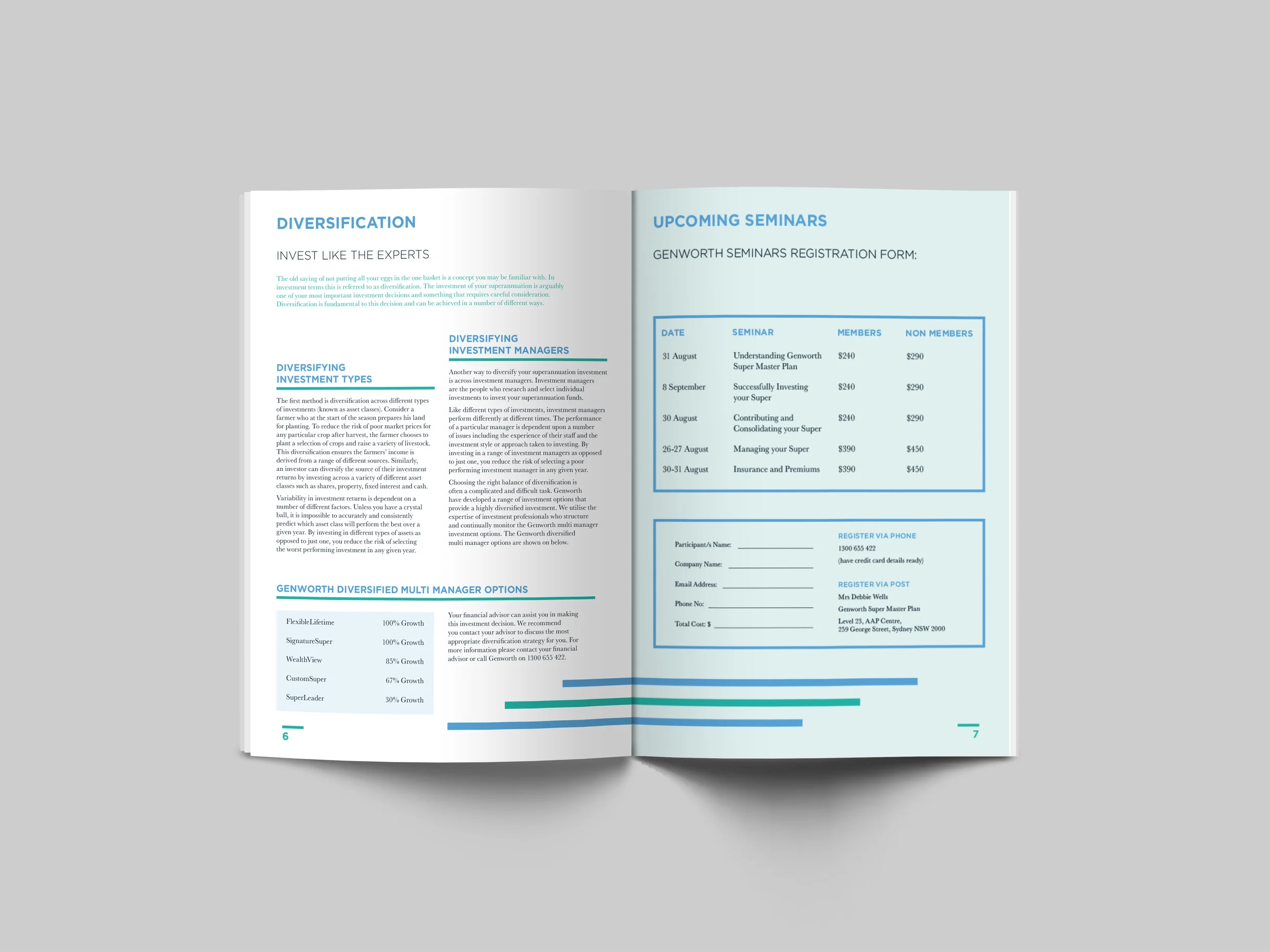 The Level is an in-house newsletter to Genworth Financial Employees about their current and future investments. The design and titling are inspired by an effort to communicate honesty about employees financial options.