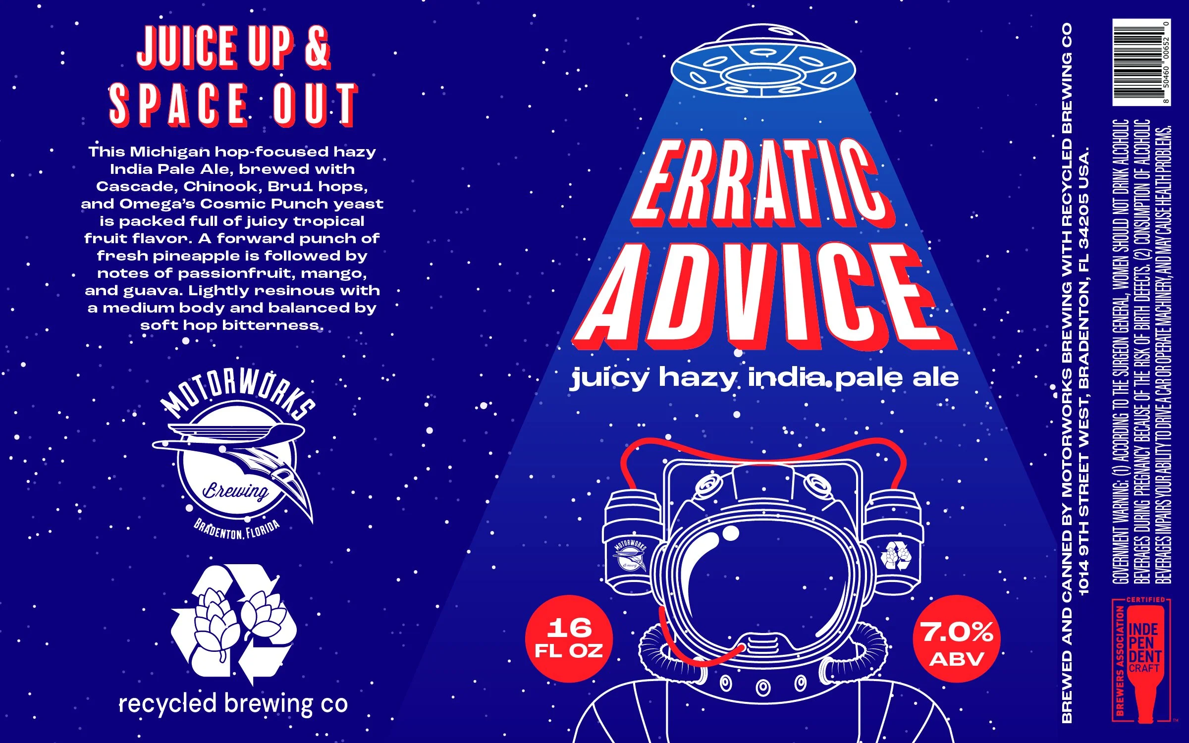 I designed this beer can label for a juicy, hazy IPA called Erratic Advice, for Motorworks Brewing in a brewing collab with Recycle Brewing. Our Hazy IPAs use a special yeast called Cosmic Punch to achieve their hazy glow, which inspired the space-themed illustration. If you look closely, you'll notice each brewery's logo on each beer in the astronaut's helmet! :)