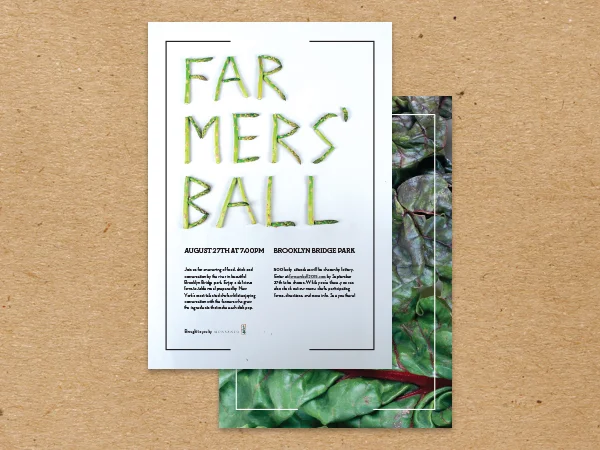 In an effort to address an image problem, Monsanto sponsors an event meant to make the company seem more transparent and honest about the food they’re producing. Farmers’ Ball is a farm-to-table dinner event at which real Monsanto farmers would be in attendance to talk to families about the ingredients they provided for the meal and explain more about the journey the food has made from the field to the table. Branding for the event evokes an attitude of honesty about food through fresh food photography (my own), simple type and clean white space.