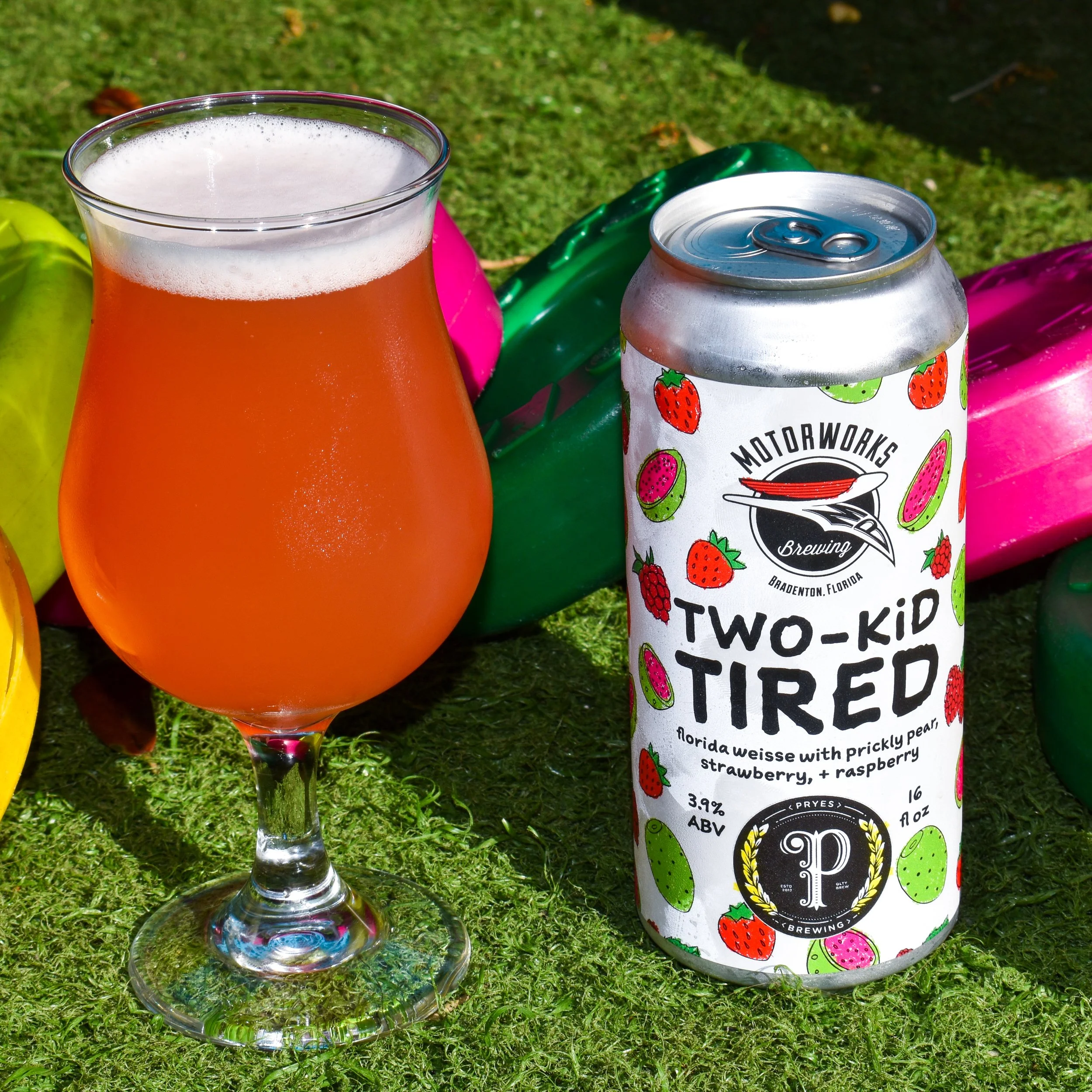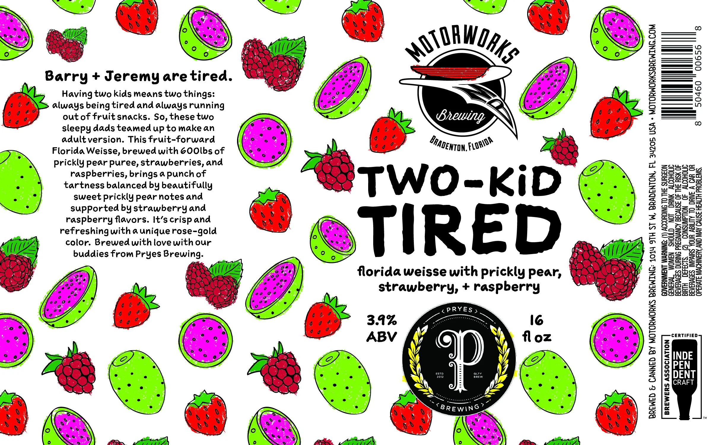I designed this can label for a fruited Floridaweisse (sour) called Two-Kid TIred for Motorworks Brewing. The design features a pattern of child-like drawings of the fruit flavors in the beer, as if colored in with crayons. This beer's tongue-in-cheek name came from a late-night brainstorming sesh between two very tired dads, in case you're wondering. :)