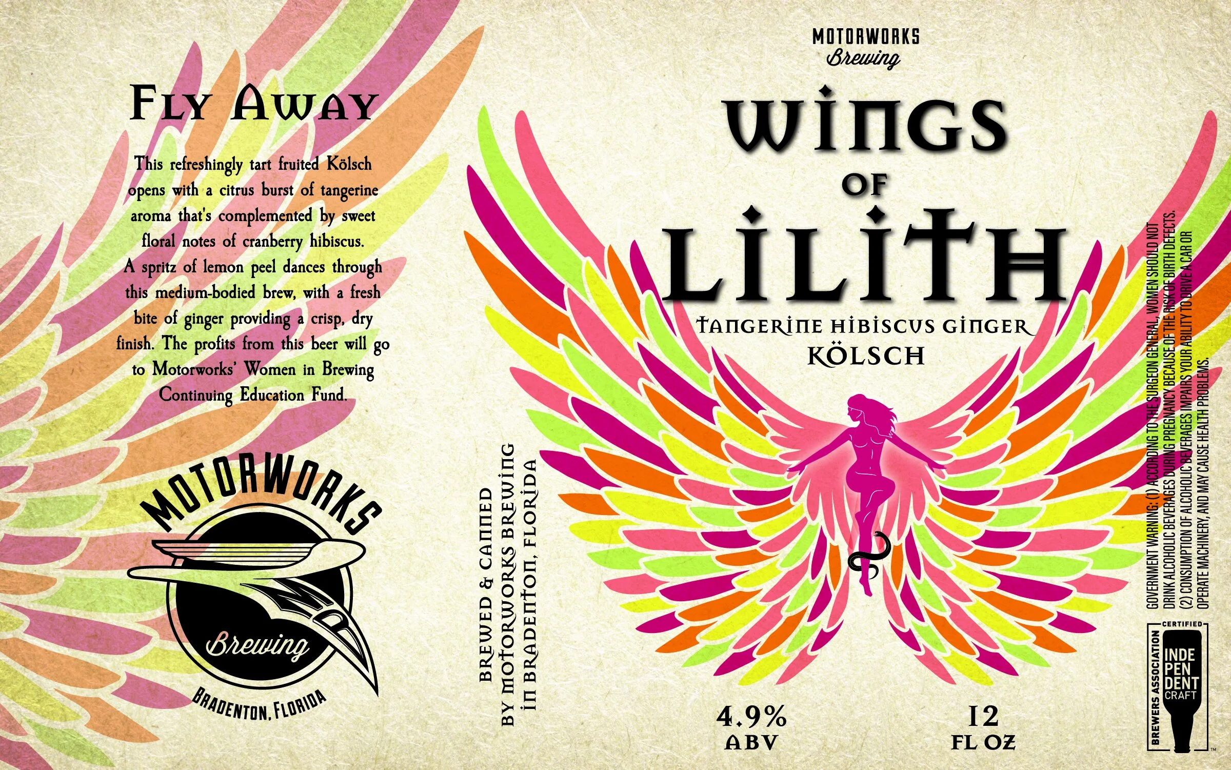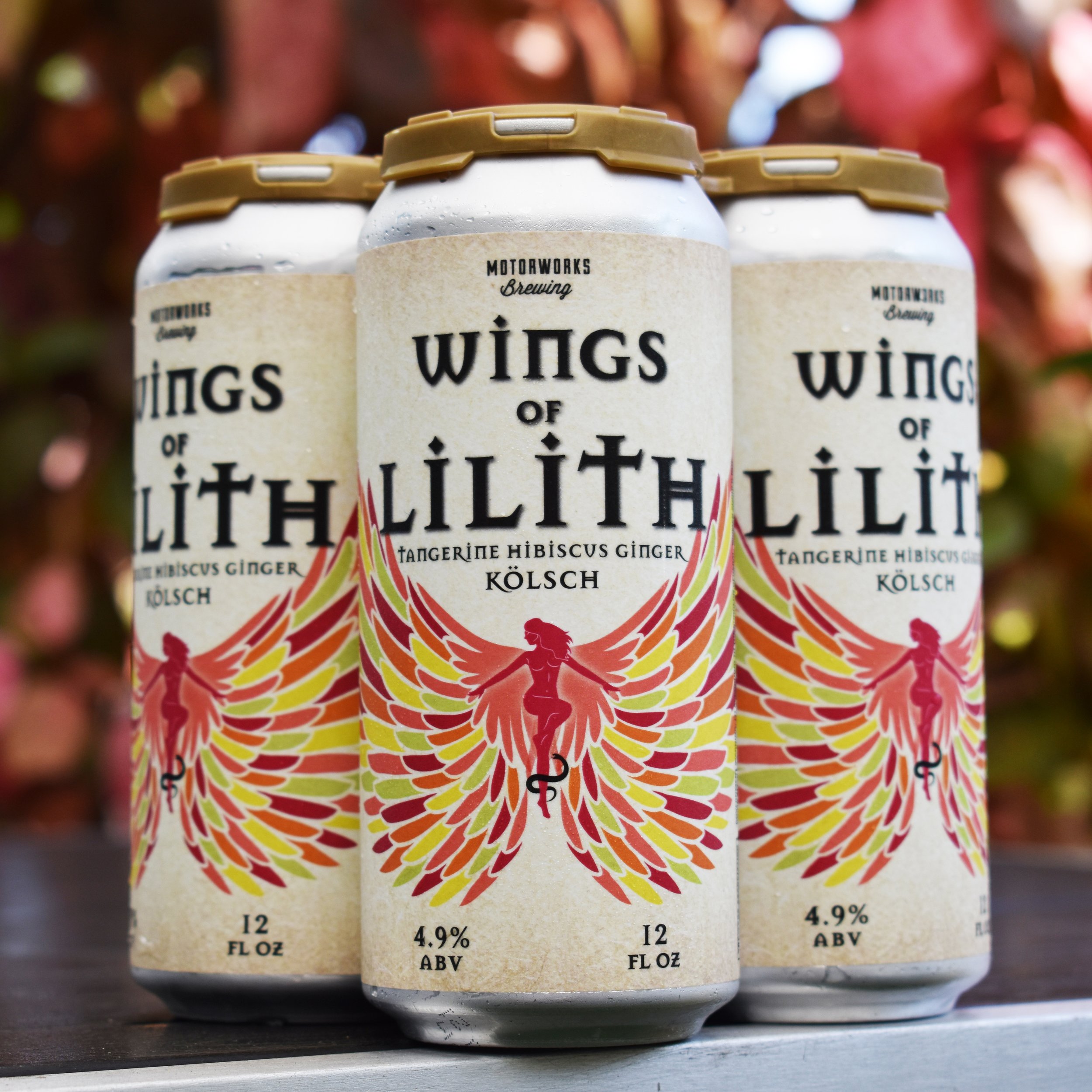 I designed this can for Motorworks Brewing for Female Brewfest 2021. "Wings of Lilith" is a tangerine hibiscus ginger Kölsch, with a name focused on inspiring women in the brewing industry to spread their wings in their work.